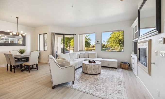 Enjoy our beautiful condo in the exclusive lakefront Palm Cove community in McCormick Ranch! With comfort in mind, no detail was overlooked. The kitchen, living and dining room are perfect for entertaining or relaxing. From your private patio, tranquil sunrises & sunsets over Marguerite Lake await you. Take a 3-minute lakefront stroll to over a dozen restaurants & many specialty shops. Miles of walking paths are just outside your door. Community HEATED pool + hot tub.