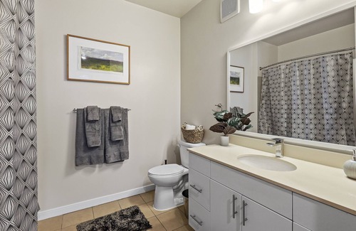 The unit has an open layout. There are two large bedrooms with on suite bathrooms, laundry, smart TVs, large windows and keyless entry.