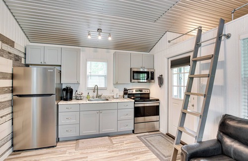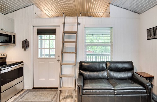 - NOTE: The single-story cabin requires using an outdoor staircase to enter and a ladder to access the lofted sleeping area