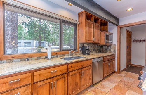 This condo has all the upgrades and charm to make your Sunriver experience truly exceptional. The family chef will feel right at home in the gourmet kitchen with custom cabinets, slab granite countertops, stainless appliances and, commercial-grade gas range. An adjacent dining area features a wood farmhouse table with seating for 6 and opens up to a great outdoor living space with comfortable patio seating and a gas BBQ for hosting summer meals. Head back inside to the living area, tastefully decorated with leather seating that boasts a TV, gas stone fireplace, hardwood flooring, board games, and books-creating a great cozy feeling on a snow-filled winter night!