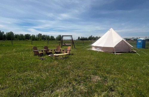 Breathtaking views of the Tetons and Big Holes. Cozy tent and campground ready for making memories. 1 king size bed, twin size trundle day bed that can be converted into two separate twin beds or a king size bed. There is a porta potty but NO WATER to the site. You are welcome to bring your own sleeping bags to accommodate a larger party. Fire pit with roasting sticks available. Rise early and watch the sun rise in the bench swing. Enjoy this one of a kind experience with your family and friends.