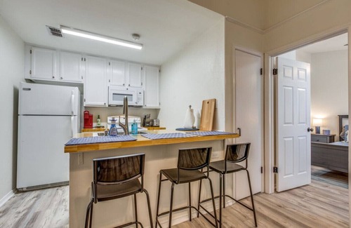 Whether you are in SA to work or play, this quaint and charming condo is the ideal home base for your time in the River City. As you walk in, you’re met with a welcoming living space and a fully equipped kitchen. Have fun making the most of the space, which is perfect for entertaining, playing games with friends, preparing and enjoying a home-cooked meal or lounging.