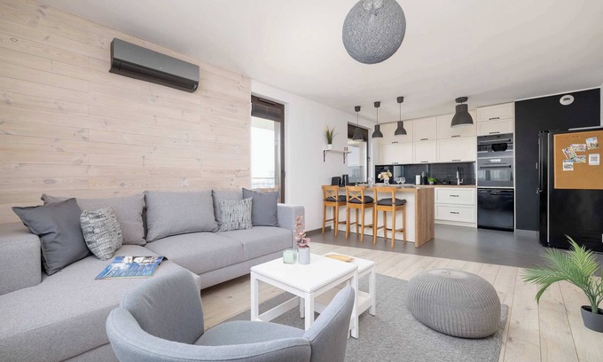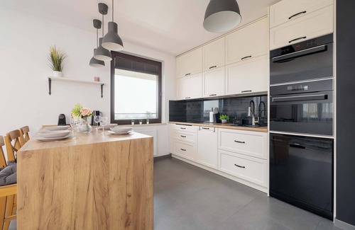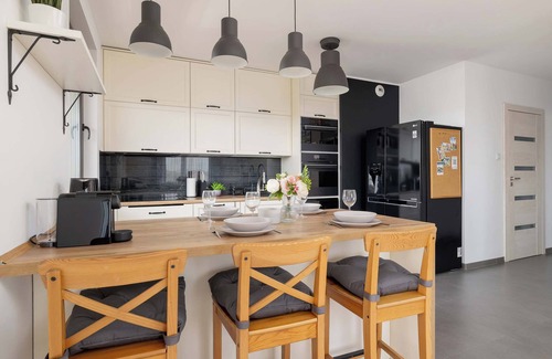 This modern 74 sq m apartment boasts a bright and functional interior, where every detail has been carefully considered to ensure maximum comfort. The space is decorated in an elegant, minimalist style with subtle decorative accents that create a cozy and harmonious atmosphere. The living room is the heart of the apartment – bright and spacious, with a comfortable sofa, armchairs, and coffee table, creating the perfect place for relaxation and gatherings. Large windows let in plenty of natural light, and access to a charming balcony with garden furniture allows for outdoor relaxation and enjoying your morning coffee prepared in a capsule. The living room also features a Smart TV with internet access, allowing you to fully relax while watching your favorite programs and movies. The kitchenette is equipped with modern appliances that make preparing meals a true pleasure. An induction hob, oven, dishwasher, toaster, refrigerator with freezer, electric kettle, microwave, and a complete set of tableware are available. The apartment offers two comfortable bedrooms. The first bedroom is decorated in calm, subdued colors, with a large bed and elegant accessories, ensuring complete comfort for sleep and relaxation. The second bedroom, in addition to a cozy bed, features a functional desk – an ideal place for remote work or studying, an added bonus for those needing a space to concentrate. The tasteful bathroom with a bathtub has been designed with attention to every detail, offering elegance and convenience for daily care. The apartment's washer-dryer is an additional advantage, facilitating longer stays and ensuring complete comfort.