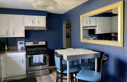 The Master bedroom has a half bath with an electric fire place for ambience or heat. We also have in-room air conditioner if you prefer white noise & a fan(in the summer). The bed is super comfy, & the sheets/blankets are always clean for each guest:) There is a walk in closet to store your luggage, along with the iron, ironing board, & hangers. There is also a smart Roku tv that plays practically everything & has all your favorite apps!