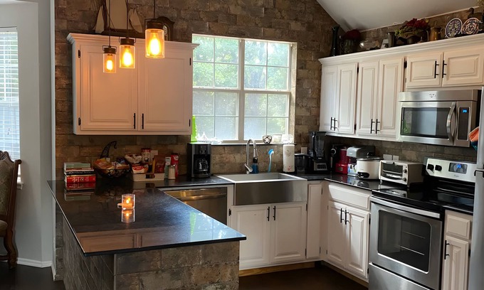 The fully fenced yard features a pool and spa, and a private forest with trails! Other amenities include a massage chair, smart TVs, games, and children's toys and books. Coffee and various breakfast items are included. Located only 3 minutes from I-35 (Waterloo Road exit) for easy access to Oklahoma City (or a convenient stop on your travels).