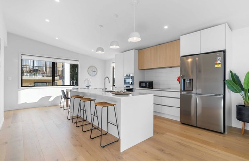 Upstairs, the open-plan living area features a raking ceiling and large stacking doors that open onto a sun-drenched balcony—the perfect place to relax or watch the tide roll in. The sleek galley kitchen is equipped with top-end Bosch appliances, including double wall ovens, an induction cooktop, and an integrated dishwasher. An LG plumbed double-door fridge freezer ensures chilled drinks are always on hand.