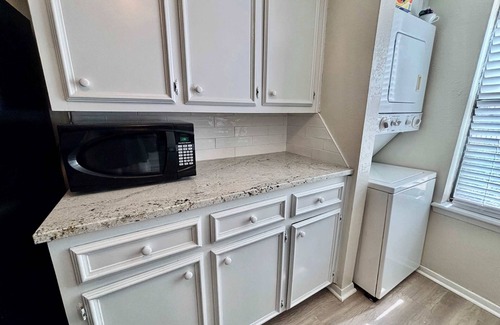 Our spacious kitchen comes stocked with all the cooking and utensil basics needed to enjoy a meal during your stay. An oven, fridge, dishwasher, toaster and other appliances make this kitchen enjoyable to cook in. The dining table is just beyond the kitchen and has seating for 4. There is also a half bath in this area.