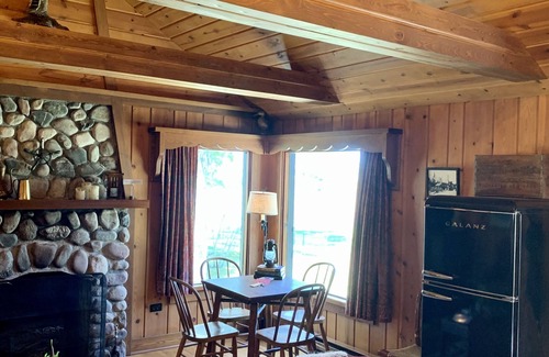 Inspired by its namesake, the beautiful Merganser duck, the cabin is decorated in rich reds, dark green, black, and rusty cinnamon. Dressed in delightful checks and plaids, it has a gracious sportsman feel. Its open floor plan and vaulted ceiling afford plenty of room to gather at both the breakfast bar and cozy seating beside the stately stone fireplace. The dining table, with its corner windows, affords a lovely lake view; the perfect place to piece together a puzzle or watch the setting sun. There are numerous original Bliss furnishings throughout. The bedroom’s crisp linens and velvet edged shams lend a rustic, delightfully comfortable feel, perfect for snuggling on a chilly night. The galley kitchen is stocked with all the cookware and tools you’ll need to prepare a delicious dinner.