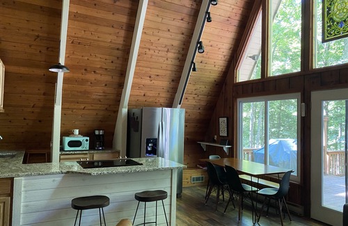Merlin Hütte offers 4 bedrooms, 3 full bathrooms, a renovated kitchen with new appliances, wood burning fireplace, washer and dryer, and a magical A-frame of windows with a view of the woods.
