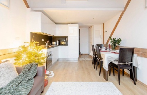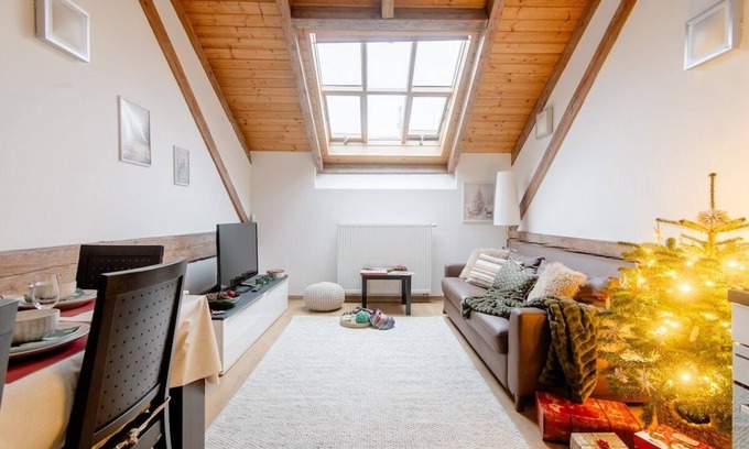 Experience "Merrywood apartment," a festive two-storey retreat for four. Enjoy two inviting rooms, an upstairs bathtub, and downstairs, unwind in a cozy living room with a TV. Immerse yourself in the warmth of Christmas charm.