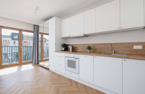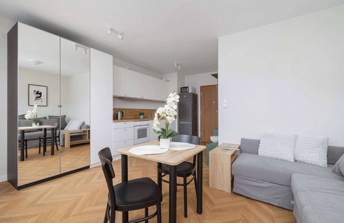 This unique 25 m² studio has been designed for people who value modern style, comfort and clever use of space. Ideal for both short stays and longer rentals, it combines functionality with a cosy, homely atmosphere. The interior exudes peace and elegance - dominated by bright, natural colours that optically enlarge the space and create a relaxing atmosphere. In the lounge area there is a sofa bed, which serves as a comfortable place to rest during the day, and in the evening it easily turns into a bed ensuring a comfortable sleep. Next to it is a table with chairs, which is great both as a place to work and for eating meals. For lovers of relaxation, there is a TV with the Smart TV function and access to Internet TV, allowing the use of streaming platforms and online channels. The kitchenette has been fully equipped with modern appliances that will satisfy even the most demanding users. Guests have at their disposal an induction hob, oven, dishwasher, as well as a coffee machine and a set of dishes and cutlery, everything necessary to prepare and eat a meal in comfortable conditions. The bathroom is decorated in a modern style, with high-quality finishing. It has a spacious shower with a glass cabin, a sink with a large mirror and a washing machine, which allows for independence during longer stays. An additional advantage of the apartment is a parking space, belonging to the apartment and located on the premises of the building.