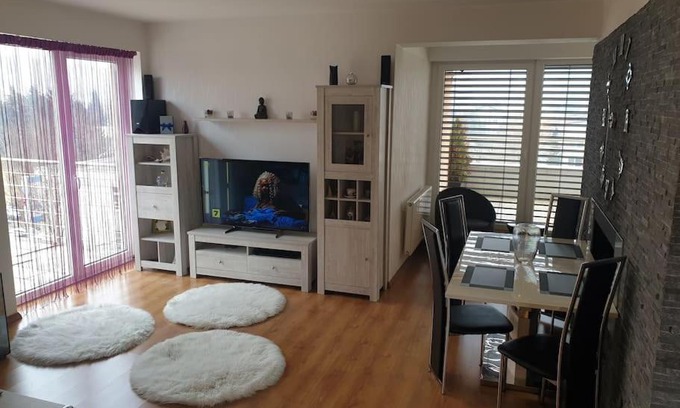 Offering a garden, Mezonetovy Apartmán v centre Novej Dubnice offers accommodations in Ilava. This apartment provides air-conditioned accommodations with a balcony. There's an outdoor pool and guests have access to free Wifi, free private parking, and an electric vehicle charging station. Providing a terrace and mountain views, the spacious apartment includes 3 bedrooms, a living room, satellite flat-screen TV, an equipped kitchen, and 1 bathroom with a bidet and a bath. Towels and bed linen are provided in the apartment. There's also a seating area and a fireplace. Beckov Castle is 26 miles from the apartment. Piesťany Airport is 33 miles away.