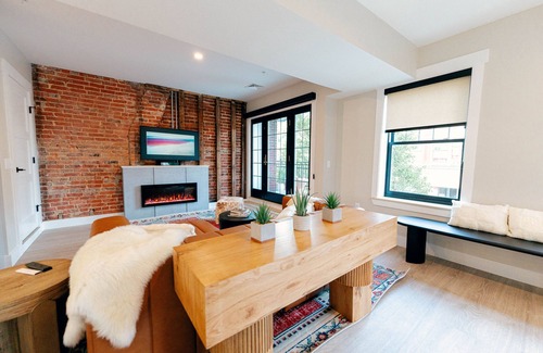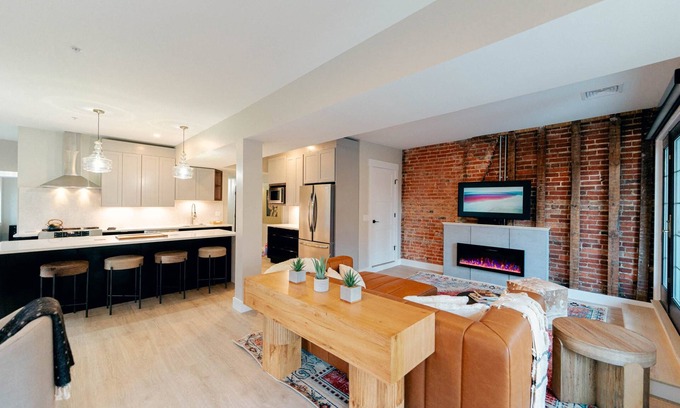 Our stunning 3-bedroom mezzanine loft in the historic Keystone Building combines modern luxury with charming vintage appeal.