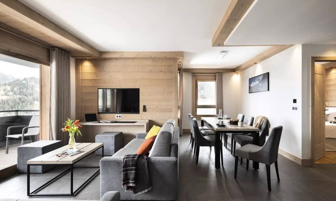 Details: Internet access / WiFi : Included Pets Allowed : Pets allowed with a surcharge of € 100/animal/week. On presentation of a rabies certificate (one animal maximum per apartment). Domestic animals must be kept on a leash in the common areas and are prohibited in the vicinity of swimming pools and recreational areas. Charging station for electric cars Ski lockers : with dry shoes Bail : 500 hammam : accessible to Wellness Baby kit : beds, high chairs, changing mattresses, strollers, bottle warmers, pots and walkers Maintenance kit : cleaning product kit + towel laundromat : laundry with washing machine and dryer, see rates on site Towels : Included Beds made on arrival : included (excluding sleeping in the living room) Raclette grill rental : Raclette, fondue, pierrade and pancake appliances Final Cleaning : included (outside kitchen corner) Star rating : 5 Covered parking : a covered parking space included by accommodation Heated pool : indoor heated pool, children's pool Near airport : Lyon Saint-Exupéry Airport #LYS (179,4 km), Turin Airport #TRN (113.0 km), Geneva International Airport Cointrin #GVA (102.6 km) Sauna : accessible to Wellness Spa : Espace Care Spa Montagne du Monde® - additional care Tourist tax : to be paid on site at current rate Balcony kettle Coffee maker : Nespresso ® type filter coffee maker and capsule coffee maker Cooked Exposure : North Toaster Top of the line Dishwasher Beds made on arrival : included (excluding sleeping room) Final Cleaning : included (outside kitchen corner) Microwave oven Number of bedrooms : 3 Number of double bed : 1 Number of single beds : 4 Number of pieces : 4 Number of toilets : 2 Number of bathroom : 1 Car park : 1 covered parking space included Cooking plate Bathroom : 1 Towel dryer Hair dryer Surface (m²) : 83 Television View : Mont Blanc Massif Wireless : Included Towels : Included