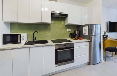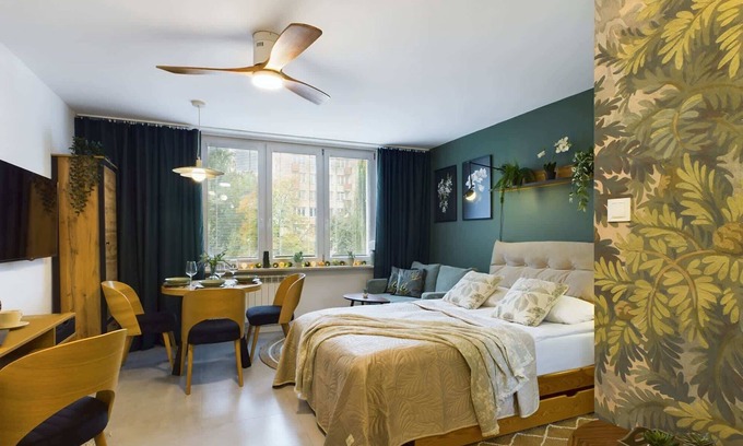 This atmospheric and cozy, stylishly decorated studio for three people is an ideal place to relax for couples, business travelers and parents traveling with a child. The unit is located on the second floor, and dark and light shades of green were used to decorate it. The apartment is also not lacking in wooden and beige accents, which makes the indoor atmosphere very friendly and comfortable. In the living area there is a green sofa along with a comfortable double bed. The studio is also equipped with a television with access to cable channels, where you can relax in the evenings. The room also features a small table, a spacious wardrobe with a washing machine, a dining table with chairs, and a desk for remote work. An additional advantage is the high-speed fiber-optic internet, which provides excellent conditions for efficient work from home. The presence of plants, carpets and carefully selected decorations makes the arrangement look really impressive. Meals can be prepared in the kitchenette, which has appliances such as a mixer, oven, transfer coffee maker and microwave. In the bathroom, a welcome toiletries set with towels, a hairdryer and a shower await guests. A remote-controlled ceiling fan has also been placed in the unit for the comfort of visitors.