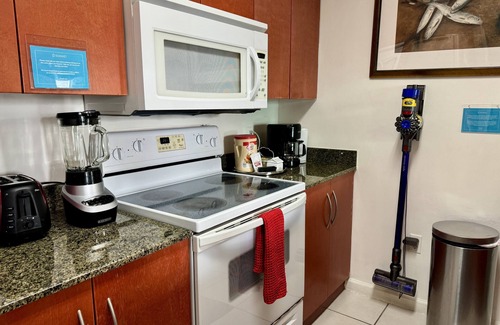 The condo provides a kitchen with a refrigerator, an oven, a stovetop, and a microwave. For a bit of entertainment, a flat-screen TV comes with cable channels, and guests can also appreciate conveniences like a washer/dryer and an electric kettle. Housekeeping is available once per stay.