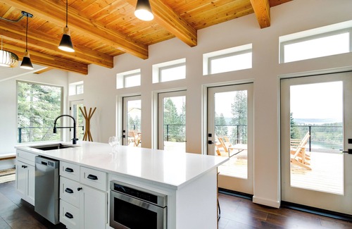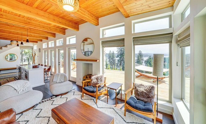 Redefining the modern lake house, this 2-bedroom, 2.5-bath vacation rental is a destination in and of itself. Unwind from your travels in the bright, airy, lake-view interior, or step out for some fresh mountain air and take in the views on the 1,000-square-foot deck. When adventure calls, enjoy direct access to Lake Coeur d'Alene via Cave Bay or keep yourself grounded with a scenic hike along the shoreline. Either way, you'll love coming 'home' to this contemporary hilltop hideaway.