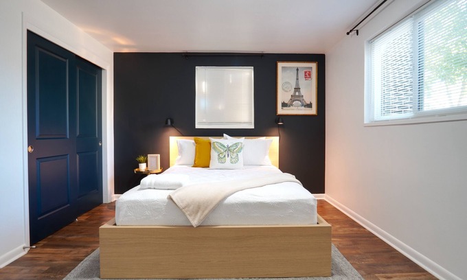 Welcome home to this beautiful newly updated bright and spacious Mid Century Modern home with extra large windows from end to end letting in tons of natural light. Brand new modern kitchen with all the necessities to make you feel like you’re cooking at home. In the kitchen you will also find yourself with another large window allowing all the possible light you can want, as well as a set of full size washer and dryer for laundry. Right behind the kitchen there is a half bath and as you walk down the stairs you will find the 2 bedrooms and a full size bathroom. Each bedroom has a comfortable queen size bed and plenty of space for all your clothes in the large closets. One bedroom has a desk for work with internet speeds at 100+ Mbps. Exterior has a great wood deck for enjoying your morning coffee or winding down in the evenings. Parking won’t be an issue as there is parking in the back of the property for 2 cars.
