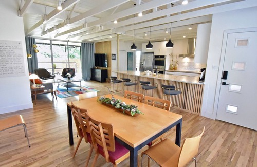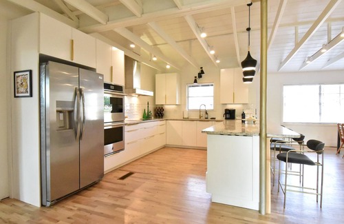 This home has been designed and extensively renovated to bring in natural light with floor to ceiling windows in the living room and master bedroom. It features hardwood floors, exposed beams in the large living, dining and kitchen area with a fully furnished state of the art kitchen. Two Queen bedrooms share a spacious shower bath. On the opposite side of the house is the King master bedroom and bath featuring both a shower, a freestanding tub, and a large walk in closet.