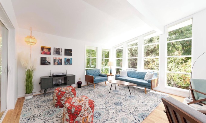 This is a unique opportunity to stay in a residence originally built in 1962 and designed by one of Frank Lloyd Wrights students. The residence was completely remodeled and finished in early 2023 by the new owner remaining true to the period and making it much more than your typical vacation rental. The luxurious home is furnished with high quality period furnishings, Smart TVs with cable in 4 of the 5 bedrooms, a fully stocked kitchen, and beautiful deck with a fire pit and valley views. Central AC was also installed.