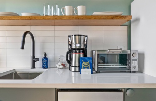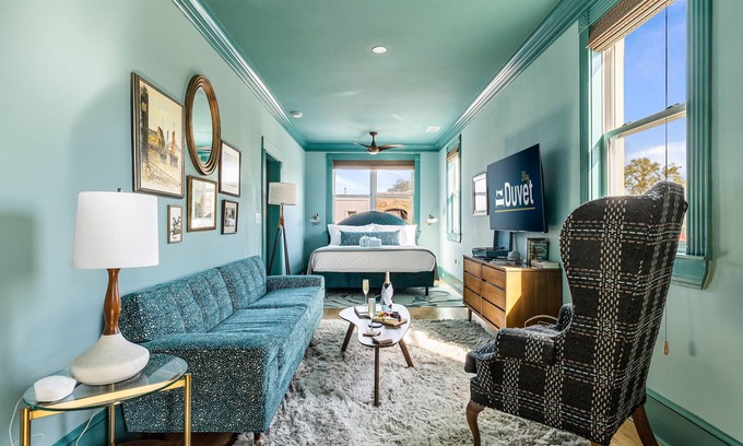 There’s nothing to feel blue about in this gorgeous jewel box studio apartment, which features an open concept living, eating, and sleeping space. The cozy living area offers seating for a small group and a large Smart TV, in addition to a vintage record player and a selection of records to create your own soundtrack for your visit. The newly renovated kitchenette comes equipped with a sink, counter top range, full size fridge, dishwasher and toaster oven.