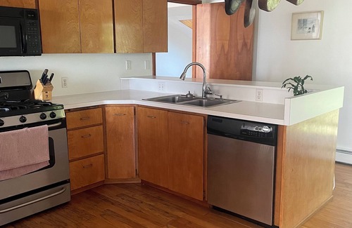 The roomy, open kitchen will quickly become the central hub for snacking, chatting, and planning your day. There is a counter with 3 barstools and a small table for seating in the kitchen with a large dining area across the hall. There is a gas grill on the adjacent deck.