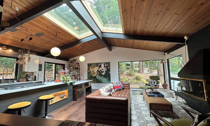 Nestled on a lush 1/3 acre private retreat, this architectural gem is just minutes away from Multnomah Village and Gabriel Park. Immerse yourself in the timeless beauty of this completely renovated mid-mod marvel, where high vaulted open beamed wood ceilings adorn every room on the main floor. This house is perfect for friend groups, families or corporate retreats.
