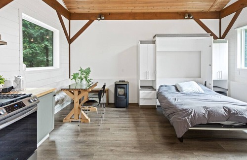 Come stay in our one of a kind cabin with a unique pellet stove! Located on a quiet street with the forest as your backyard there is no place you would rather be. Our open concept floor plan brings together all guest when cooking, hanging out, and also doubles as a bedroom. The Murphy bed is located in the main room, and can easily assemble when night falls and it's time to rest your head. Our place is perfect for your romantic getaway or vacation. Don't miss out! We can't wait to host you.