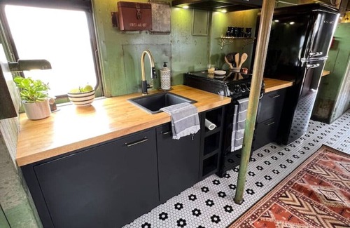 Dine outdoors on the attached patio or lounge under the stars with seating for two. Original train car stove repurposed to enjoy fire pit crackling.