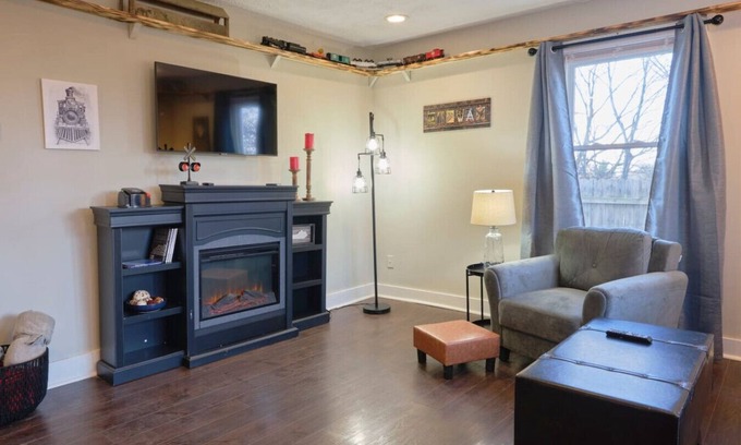 This unique place has a style all its own. The darling home sets on a large lot with view of the train tracks that run through the downtown area of Midway. Enjoy being at the end of a quiet street with all the amenities you need to enjoy your stay, while visiting this beautiful part of Kentucky close to many stops on the Bourbon Trail. With a King and a Queen bed to rest your head.