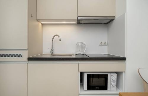 Functional and modernly furnished studio, it is ideal for two people wishing to discover the charms of Wrocław or for business travellers. The studio is located on the 4th floor and offers a comfortable stay in a stylish interior. The living area has a comfortable sofa bed with a sleeping function, which will ensure a relaxing night's sleep after an eventful day. A Smart TV and free WiFi are also available to pass the time. The kitchenette has been designed with guests' comfort in mind. It is equipped with modern built-in appliances such as a fridge, induction hob, microwave and a practical washing machine. This allows you to freely prepare meals and enjoy independence during your stay. The bathroom is characterised by a modern design and is equipped with a comfortable shower, providing refreshment at any time of the day. In addition, it is possible to come with your pet. The entire studio is decorated in bright and pleasant colours, which, combined with the functional layout, creates a cosy atmosphere.