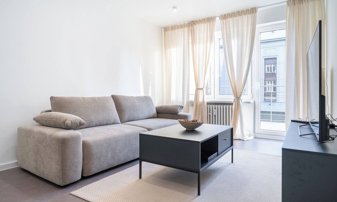 Mikołowska Deluxe Apartment is a stylishly furnished apartment featuring a living room with a sofa bed, a bedroom with a comfortable double bed, a kitchen, a bathroom, and a spacious balcony where guests can relax and enjoy a morning coffee or an evening glass of wine. Guests have access to various amenities, including a TV, washing machine, iron, hairdryer, refrigerator with freezer, dishwasher, oven, kettle, and kitchenware. Guests can also use the public parking, though parking spaces are not guaranteed.