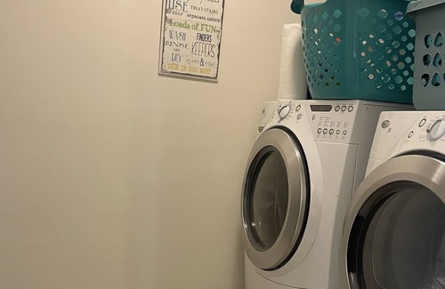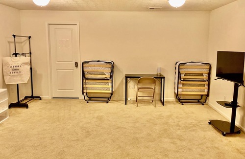 To get to the second floor, we walk back into the morning room, then the kitchen, then the living room, and finally at the end of the entrance hallway where there's a stair that leads upstairs. Go upstairs. At the top of the stairs and straight ahead of you is the laundry room. It has an HE washer and dryer. While still at the top of the stairs, if you look to your left, you'll see a nicely decorated full bathroom with double sinks, chrome faucets, black knobs and hardware, black vanity lights, gray walls, and green accents. Do not go into the bathroom. While still at the top of the stairs, look to your right and walk around the banister to face the opposite direction. On that walkway, the first door to your left is the Orange Room. The Orange Room is nicely decorated with a full-size bed, a 43" smart tv, a long closet with orange hangers, storage, a desk with a chair, seating, and more. Keep walking past that room and the next door to your left is the Blue Room. The Blue Room is nicely decorated with a queen-sized bed, a 43" smart tv, a regular-sized closet with blue hangers, storage, a desk with a chair, seating, and more. At the end of that walkway, you can walk right into the Green Room. The Green Room is nicely decorated with two full-sized beds, a 55" smart tv, storage, a desk with an office chair, double seating, and more. The Green Room also has a walk-in closet and it is currently the second largest bedroom in the house. But before you walk into the Green Room, turn right.