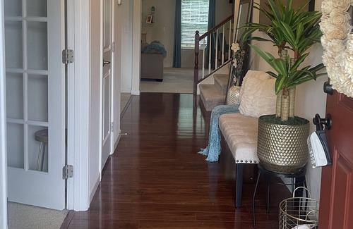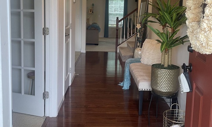 When you walk up to the house, look at the red door, and you'll see a smart lock. Touch the Yale symbol to activate the smart lock. Using the code you were given, press the numbers on the keypad, then press the checkmark to unlock the door. Open the door. When you open the door, you'll notice a hallway with beautiful floors. Enter and close the door behind you. Do not lock the bottom lock (it's covered for a reason). To your left is the main office and next to it is the coat closet. Walk past the office. Across from the coat closet is a bench to sit on to take off your shoes. Place your shoes under the bench or in the coat closet. Hang your coat up in the closet as well, if it's that season. Stand up and keep walking. To your left, you will see what is actually the dining room that is being used as the piano room. Across from the piano room, is the stairs to upstairs; it is to your right. At the end of that hallway and after the piano room is the living room. In front of you, the living room has two windows with curtains up to the ceiling; the windows look out to the large, fenced backyard. Between the two windows, you'll see a gas fireplace. If you walk into the living room, to your left, you'll see a 65" smart tv. However, if you turn to your right, you'll see a bar with two seating and the entrance to the large eat-in kitchen. The kitchen has stainless steel appliances, tall cabinets, and a large island in the middle with five stools. To the right of the kitchen is the partial mudroom with entrance options to either the half bathroom, the garage, or the door that leads down to the basement. In front of you and after the large island is a big window. To your left of the kitchen is the morning room, which is being used as the dining room. The morning room has windows all around that let a lot of light in. Turn left into the morning room and then another left to walk towards the sliding door to the backyard. Outside the sliding door is the deck with deck furniture, table and chairs, and a fire display on the table. Off the deck is a large backyard with a fire pit and four chairs as well as a playset.