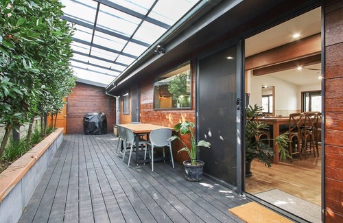 Discover this three bedroom haven, where comfort meets convenience. Comfortably sleeps seven guests - there is a sofa bed in the study. Although only a short walk from town, this fully fenced property offers privacy, thanks to the natural shield of trees from the road.