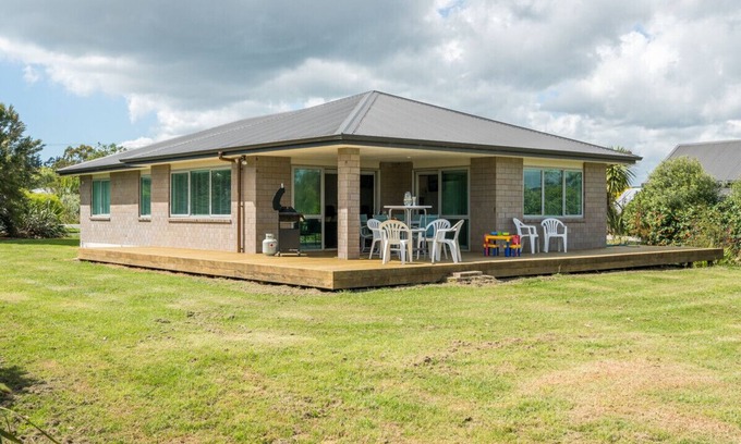This Mangawhai holiday home includes well appointed open plan living... for cruisy summer stays, wander onto the deck, fire up the BBQ, and enjoy the peaceful rural views! The generous section is ideal for family games.