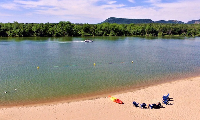 Few homes in Texas have the special combination of smooth water for sports, a view of mountains, a private sandy beach, room to bring your boats onsite and a very comfortable place to sleep 8.