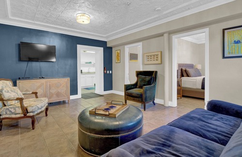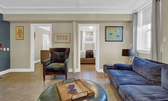 A spacious suite featuring a living area and two bedrooms, each with a queen bed. This suite has one private bathroom and includes a fully equipped kitchen.