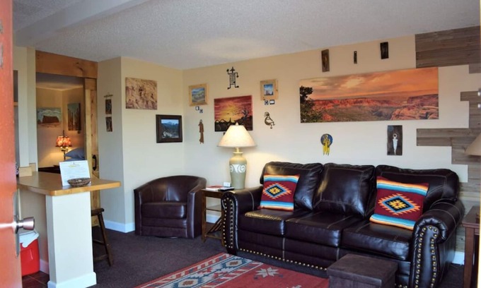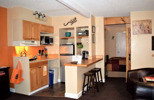 Our 5 Miners Cabins are all about 400 sq ft cabins and provides panoramic views of the Moab Rim, Spanish Valley & The La Sal Mountains with access to the surrounding National & State Parks, La Sal Mountain loop road & Ken's Lake Recreation Area. These cabins have unique history in that they were originally used as management quarters at the mines south of Moab and were relocated to this property years ago. Each cabin comes complete with a kitchenette, which includes a mini fridge, microwave, Keurig coffee maker, & double burner electric stovetop. A small living area has a flat screen TV with Direct TV and a queen sleeper sofa. Sleeping a total of (4) adults, a queen bed allows to sleep (2) guests, & the sofa bed folds out to sleep an additional (2) guests. The bathroom provides a tub with shower and the cabin comes completely stocked with linens, towels & toiletries at guest check-in (No daily housekeeping service is provided). Each Miners Cabin has its own private entrance & parking, with additional parking for adventure equipment on property. The cabin welcomes dogs only, with A $10 nightly fee (2 dogs max). Please let us know if you will be bringing a dog when making the reservation.