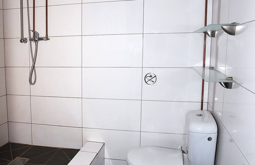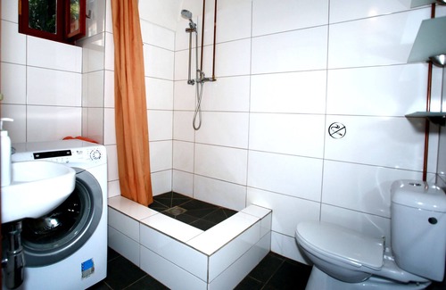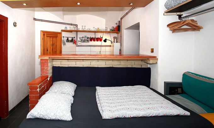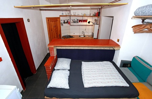 Mini studio with kitchenette (dishes, cooker, microwave, fridge), bathroom with shower and WC (washing machine, iron), smaller double-bed (125x195 cm) suitable for a couple or single guest.