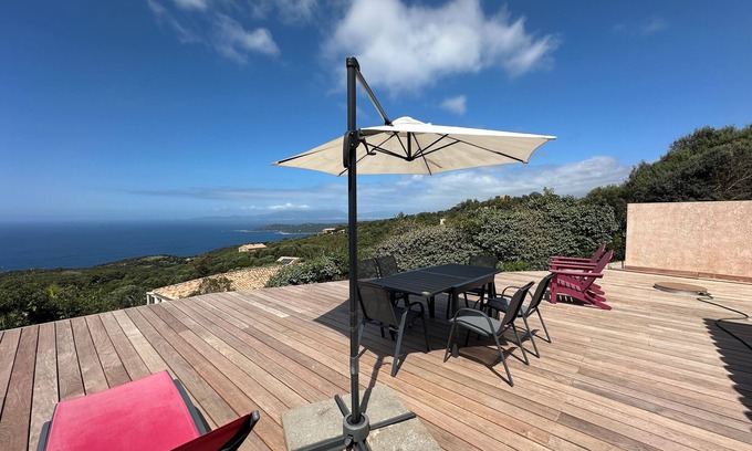The covered terrace and the private garden are quiet, with plancha and deck chairs, and facing the Sanguinaires Islands and the Gulf of Ajaccio: breathtaking views and beautiful sunsets in perspective for your family holidays in this traditional Corsican village. is Acqua Doria, in the commune of COTI-CHIAVARI.