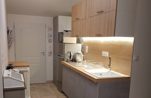The living area of the gite is pleasant and cozy: free WiFi, a smart-TV / hi-fi / DVD player area with a Freebox, and a dining area equipped with an extendable table for up to 6 people (ideal for telework), and a very well-equipped open kitchen.