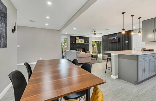 Our home features a charming living space, four cozy bedrooms, two and half bathroom, a fully-equipped kitchen, living room with a wood fireplace, and a spacious backyard. Relax on the porch and enjoy your morning coffee before starting your fun-filled day just minutes away.