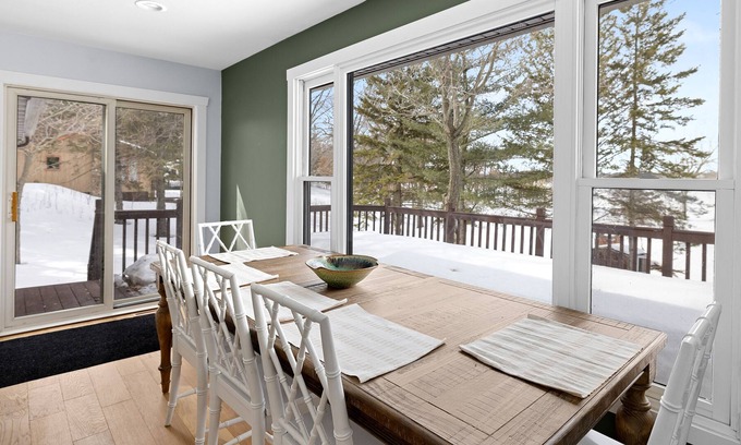 Enter the front door and you are welcomed by a large open concept living and dining room. Relax on the plush couches and catch a movie night - if you can take your eyes off the 360 views! The dining room table, which seats six comfortably, has a panoramic view of Elk Lake, gorgeous in all four seasons. Even the kitchen has a lake view, so you are never far from beauty.