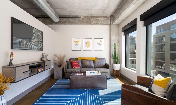 Enjoy the best of the Twin Cities from this modern Downtown Minneapolis condo, which is perfect for business trips or city getaways. This modern loft has everything you need for a comfortable and productive stay. Sable 27's bright living room is decorated in a fun modern style with vibrant décor and lush greenery.