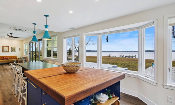 This impressive 5BR, 4.5BA waterfront home was fully renovated in 2020 and provides the perfect place to host your family get-togethers. The magnificent, panoramic views of Harris Creek and Tilghman Island are framed eloquently by an expansive great room with 12’ x 8’ glass bifold doors that open fully onto a large outdoor deck facing the water - effectively inviting the outdoors in! The great room seamlessly connects to the nearby chef-inspired kitchen, overflowing with counter space and a large butcher block island perfect for communal cooking - get those kids busy cutting potatoes!