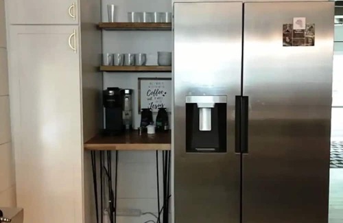 Front Master w/ 1 king bed and pac-n-play. (2adults, 1 toddler). Rear Master w/ 1 king bed en-suite full bath.(2 adults) Bunk room w/ twin over twin bunks reach in closet and lounge area. (2 children). Den w/ queen Murphy bed, lounge space and outdoor patio access w/ sliding bar door to allow privacy (2 adults). Front living room offers 72” 4K Roku TV w/ pull-out queen sofa-sleeper. Shared full bath. Kitchen fully equipped for all guests! Keurig single pod or pot, pots/pans, bowls/plates, teakettle, toaster, nutribullet and cooking utensils. Even outdoor patio dishes! Two desk office space w/ sliding barn doors to allow peace for work on the go w/ a beautiful view of back patio. Laundry room w/ washer and dryer w/ detergent included. 3 full sized spots in driveway leading to garage for beach/lake gear storage. Minutes walk to Lake, shops and more