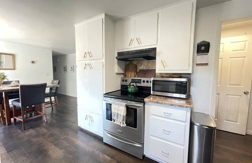 The kitchen is fully stocked with every utensil imaginable. Not only is there a microwave, dishwasher and toaster oven with an air fryer, there is a Breville crock pot, ice machine, Keurig single cup and full pot coffee maker, and single-serve blender.