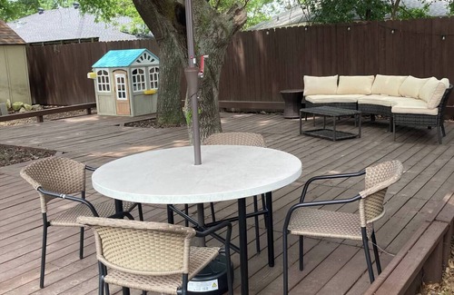 With an open floor living room and dining room there are plenty of places to relax after an action-packed day/night in town. Our spacious, beautifully decorated 3 bedroom home offers everything you need for a memorable stay. Enjoy the private backyard featuring a fire pit and kid’s play house.