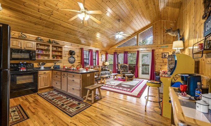 As you enter the cabin with awe, you will be enchanted with the open floor plans and enjoy the comfort of the brand new fully-equipped kitchen for all your cooking needs. After spending a long day in Gatlinburg, Cade’s Cove, Pigeon Forge, or the Smoky Mountain National Park it’s time to unwind in the spacious living room. Cuddle up on the comfy couch or the oversized glider while enjoying the stacked-stone electric fireplace in the living room and master bedroom and watching your favorite movies on the large flat screen television. Also, have a little fun and play a friendly game on the Pac-Man arcade. Experience the private hot tub on the back deck.